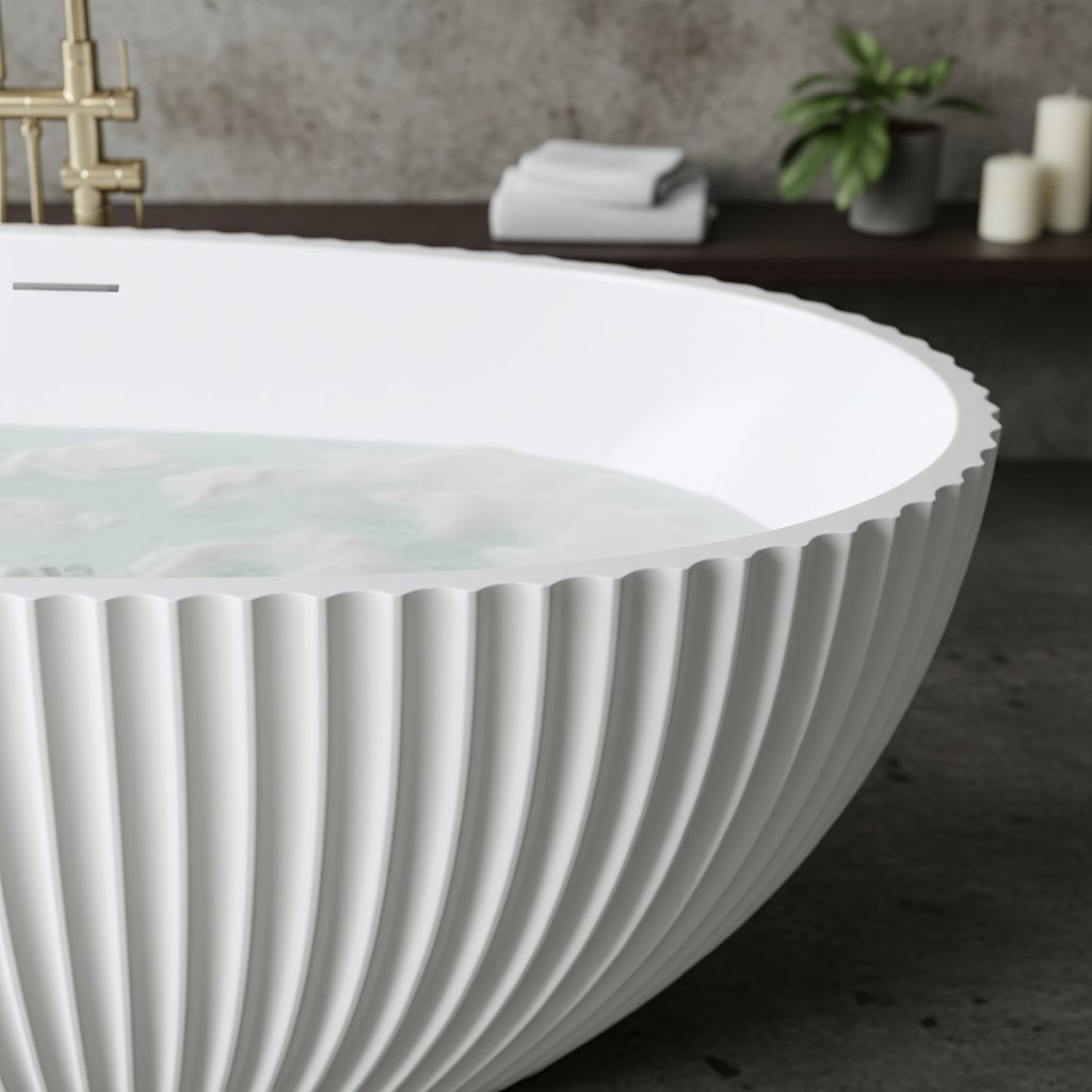 Zatímco vnitřek vany je dokonale hladký pro maximální pohodlí, vnější stěny zdobí husté svislé drážky. Tento dekorativní prvek dodává vaně hloubku, hru světla a stínu a moderní architektonický vzhled. Tvar vany je navržen jako nepravidelný ovál, což působí velmi organicky a přirozeně.