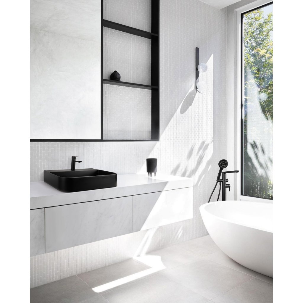 Volně stojící vanová baterie se sprchovým setem se skvěle hodí do modernistické koupelny s volně stojící vanou. Její výška a způsob montáže na podlahu dodává místnosti estetický a moderní charakter.