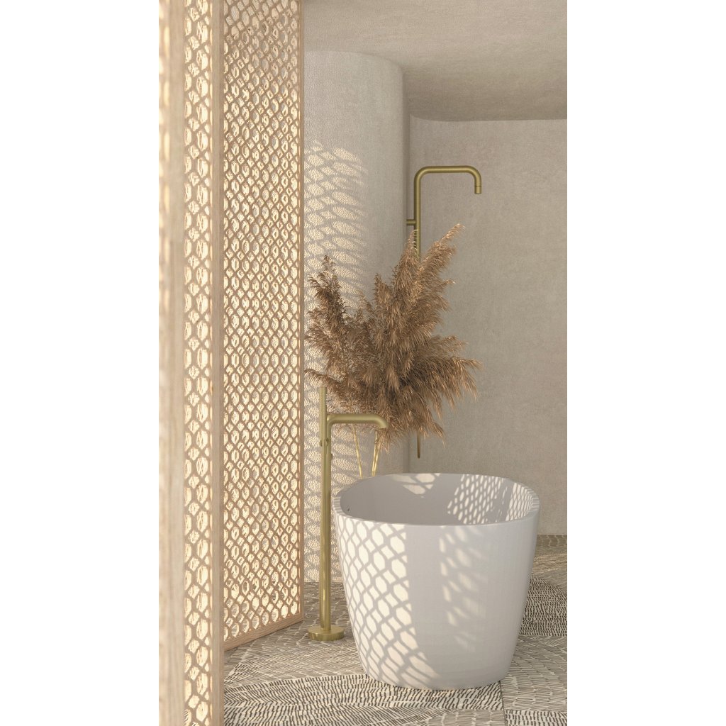 Volně stojící vanová baterie se sprchovým setem se skvěle hodí do modernistické koupelny s volně stojící vanou. Její výška a způsob montáže na podlahu dodává místnosti estetický a moderní charakter.