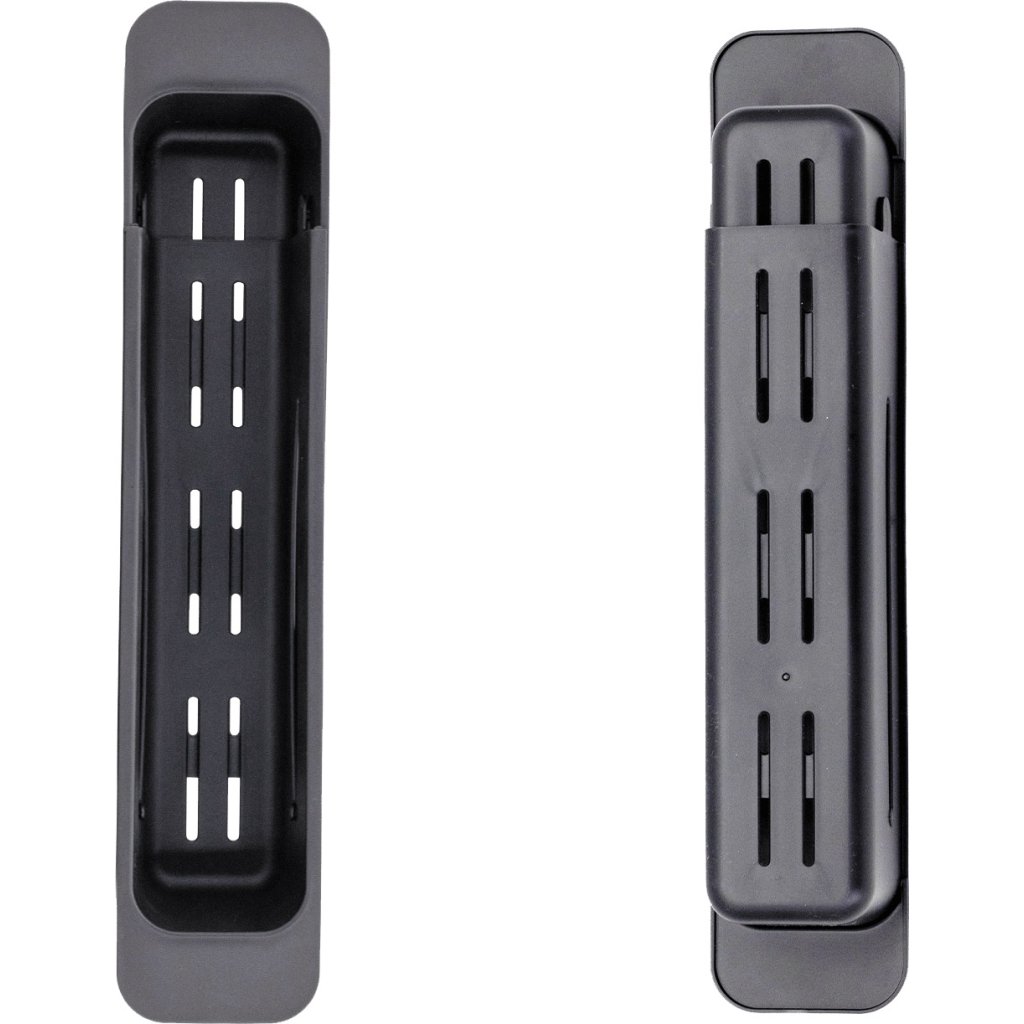 Tento výsuvný koš na dřez z plastu černé barvy je praktickým a dokonale funkčním kuchyňským doplňkem. Jeho obdélníkový tvar s perforovaným dnem umožňuje odtok vody, takže je ideální pro mytí zeleniny a ovoce. Výsuvná konstrukce koše s nastavitelnou šířkou 39,7 až 55,9 cm umožňuje jeho umístění do dřezu jakékoli velikosti. Po stranách má úchyty pro snadné vyjmutí a přepravu. Minimalistický a moderní design se hodí do většiny dřezů.