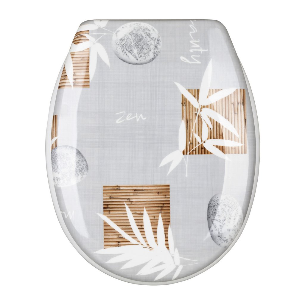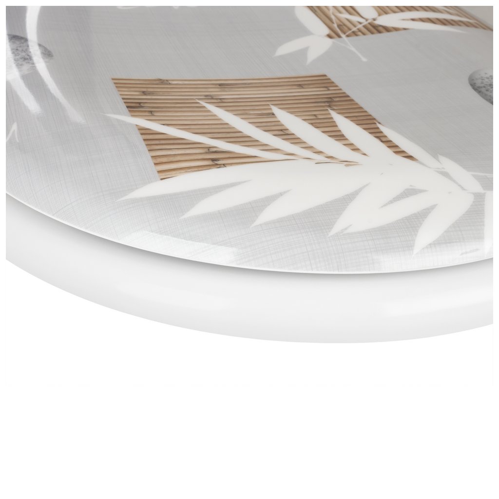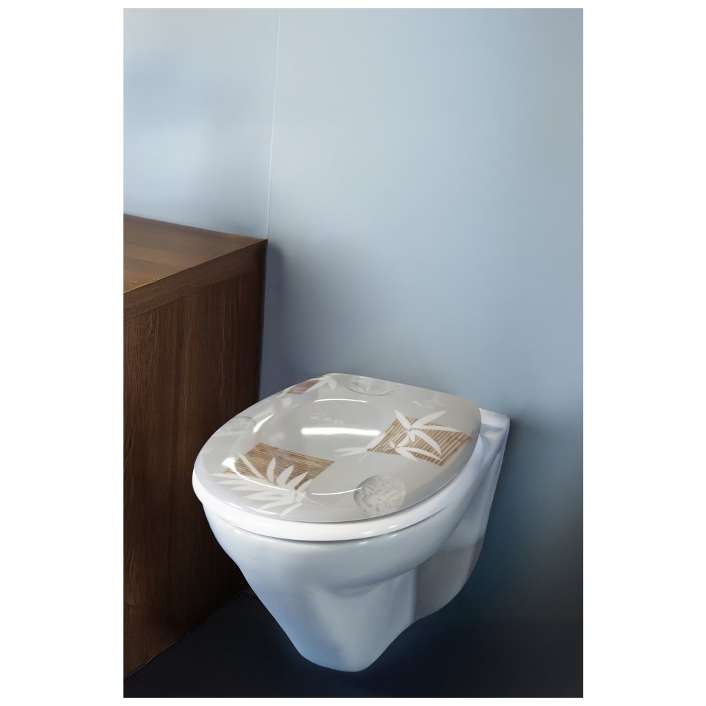 WC prkénko Calmi je kombinací moderního designu a funkčnosti. Je vyrobeno z odolného duroplastu, vyznačuje se vysokým leskem a elegantním potiskem v podobě bílých větviček, bambusové dřevěné mřížky a kamínků na šedém pozadí. Oválný tvar a univerzální velikost je vhodná pro standardní toaletní mísy. Systém pomalého zavírání SOFT CLOSE zajišťuje tiché a pohodlné používání. Sada obsahuje montážní sadu.