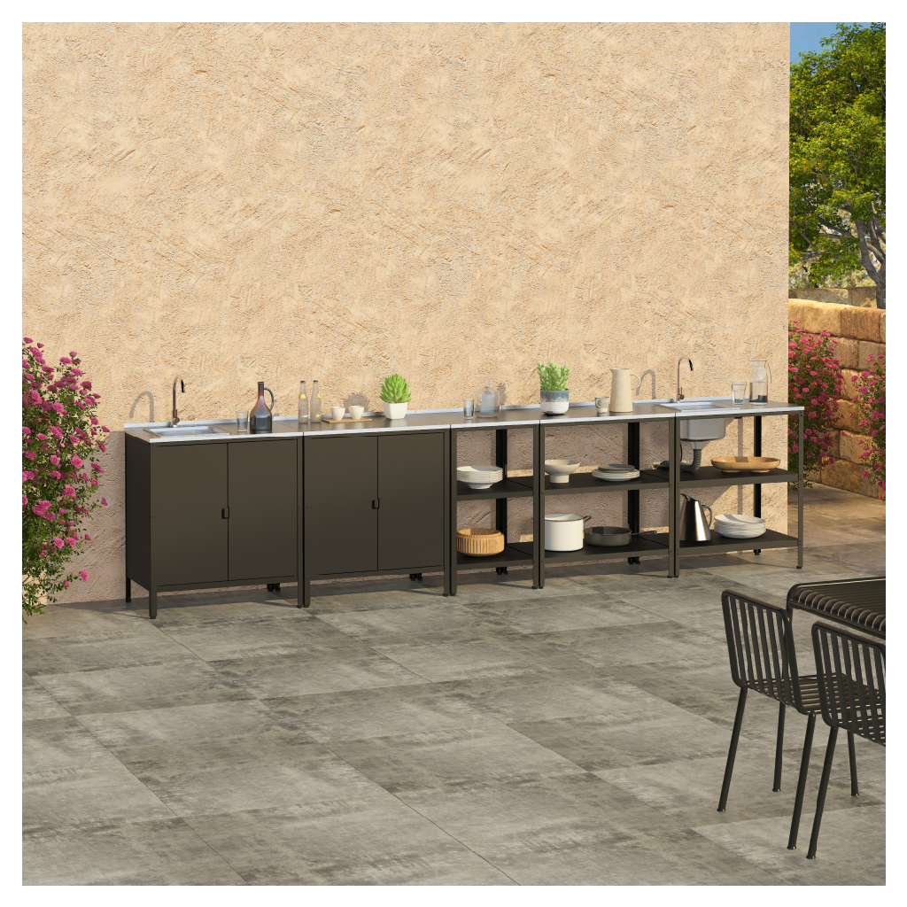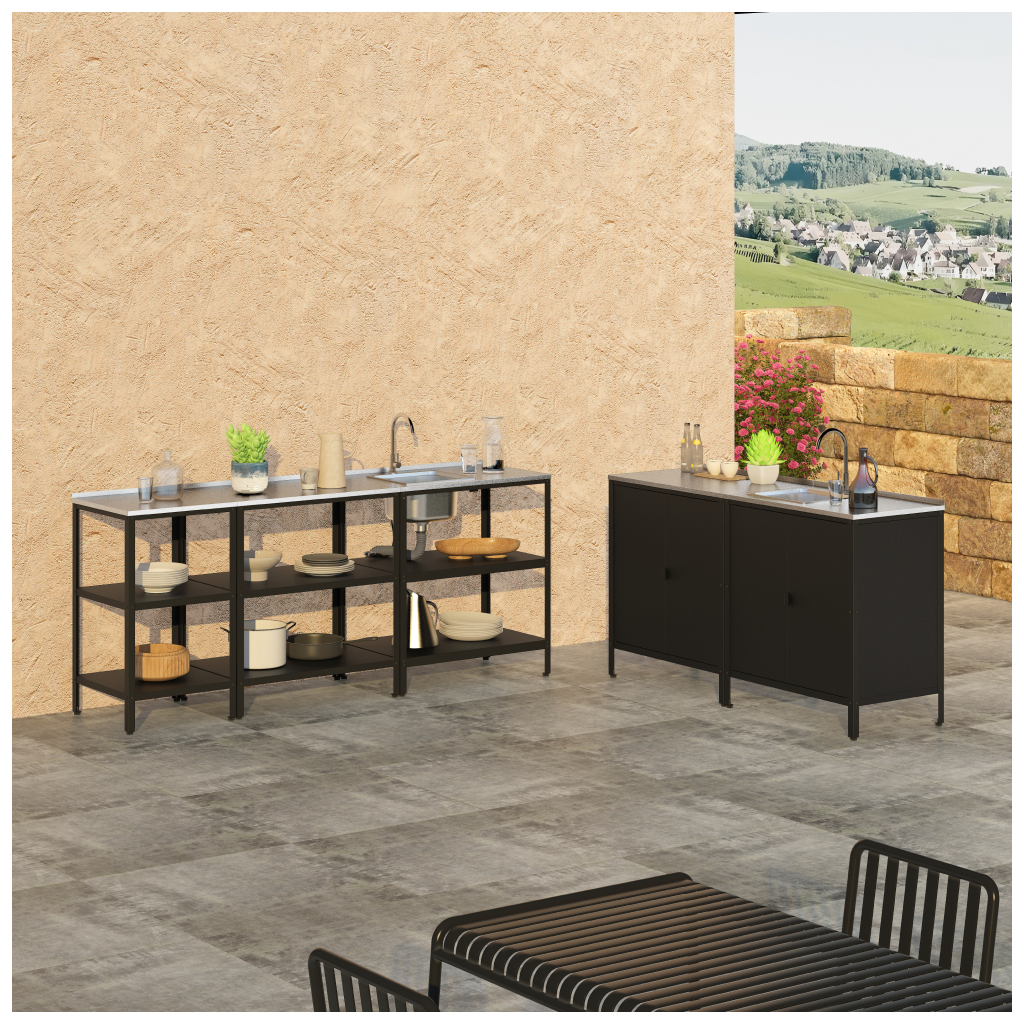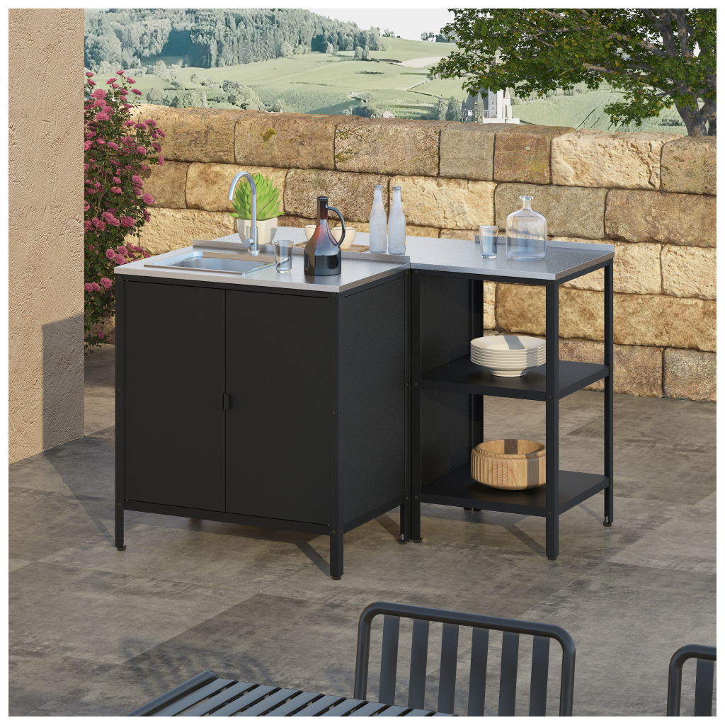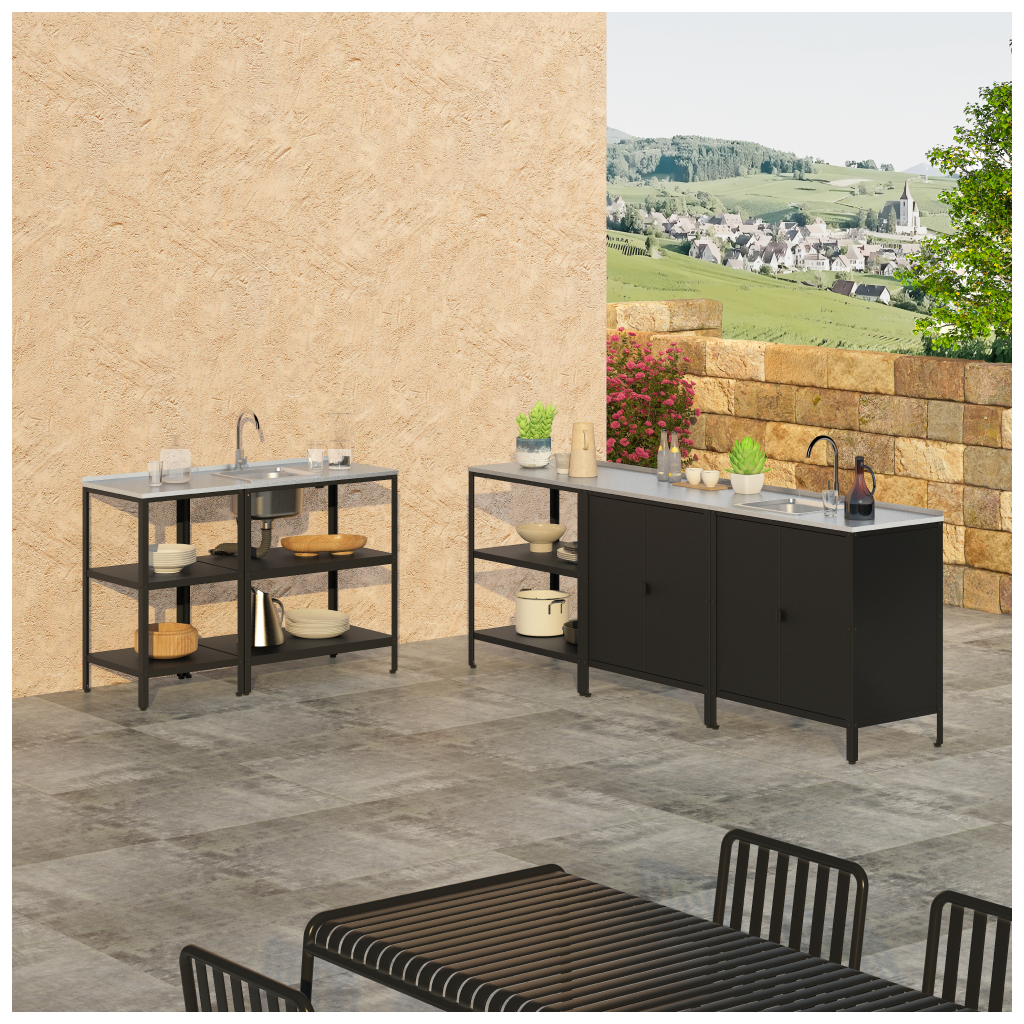 Zahradní kuchyňský ostrůvek INES TYP 1 představuje ideální způsob, jak rozšířit možnosti vašeho venkovního vaření a stolování. Tento elegantní prvek v černé barvě se stříbrnými detaily vnese do vaší zahrady nebo na terasu moderní styl a vysokou funkčnost. Je navržen tak, aby poskytoval dostatek pracovní plochy i úložného prostoru, čímž promění každé grilování v profesionální zážitek.