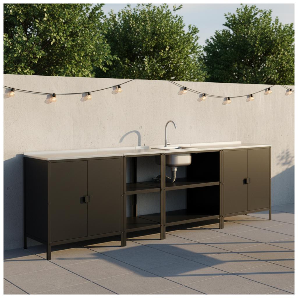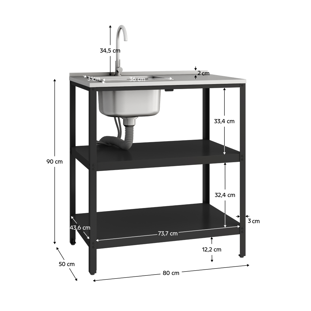 Ostrůvek je vybaven praktickým dřezem a vodovodní baterií, což z něj činí plnohodnotné pracoviště pro přípravu pokrmů přímo pod širým nebem. Stabilní rám je navržen tak, aby odolal korozi, UV záření, větru i běžným nečistotám. Díky rektifikačním šroubům na nohou lze ostrůvek snadno vyrovnat i na mírně nerovném povrchu, čímž je zajištěna maximální stabilita při práci. Dvě prostorné police nabízejí dostatek místa pro uložení veškerého potřebného kuchyňského náčiní a surovin.