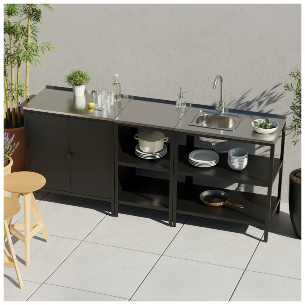 Zahradní kuchyňský ostrůvek INES TYP 4 představuje stylové a vysoce funkční řešení pro každého milovníka venkovního vaření a stolování. Tento elegantní prvek v černé barvě s doplňky v barvě stříbrné je vyroben z kvalitní nerezové oceli s ochranným práškovým lakováním, což zajišťuje jeho mimořádnou odolnost a dlouhou životnost i v náročných venkovních podmínkách. Moderní design ostrůvku se snadno sladí s dalším vybavením vaší zahrady nebo terasy.
