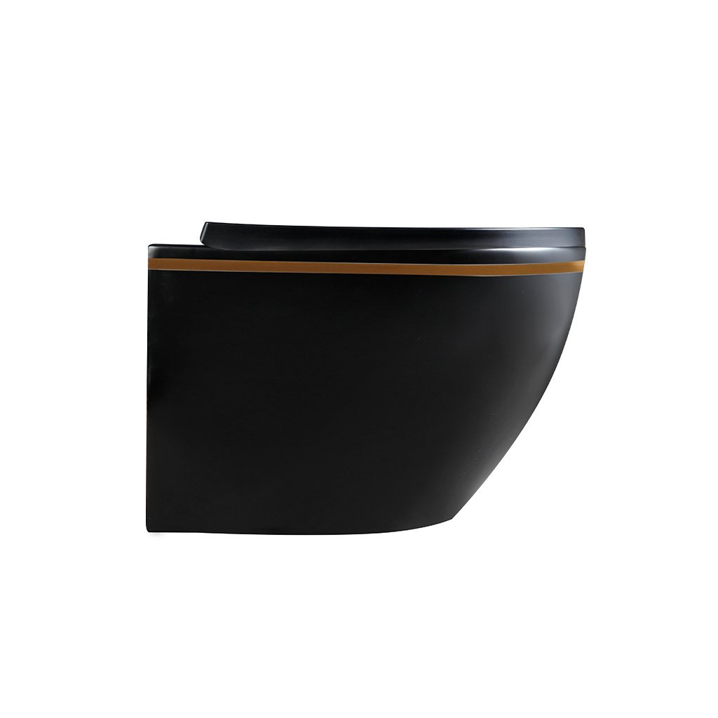 Tato WC mísa je synonymem moderny, kombinuje nejnovější technologie s elegantním designem pro zajištění maximálního komfortu používání. Bezpřírubový systém Rimless eliminuje těžko dostupná místa a usnadňuje čistění, technologie Easy Off umožňuje snadnou demontáž WC prkénka. Pomaluzavírací sedátko z Duroplastu UF se systémem tichého zavírání SoftClose zvyšuje komfort používání. Použití keramiky s glazurou ANTI-BACTERIAL GLAZE výrazně usnadňuje udržování čistoty, zabraňuje tvorbě vodního kamene a množení bakterií. Tato závěsná WC mísa se skvěle hodí do každé koupelny, nabízí úsporu místa a elegantní vzhled. Výběrem této WC mísy investujete do budoucnosti vaší koupelny, kombinujete styl, funkčnost a vyspělá technologická řešení. Tato WC mísa byla navržena v černé matné barvě se zlatým lemem, které se perfektně hodí do každého interiéru a dodává mu svěží a moderní vzhled.