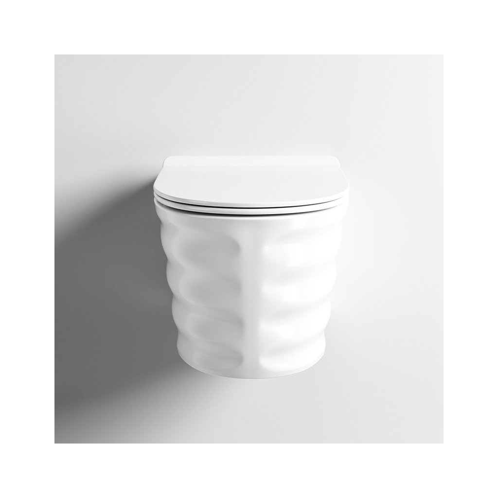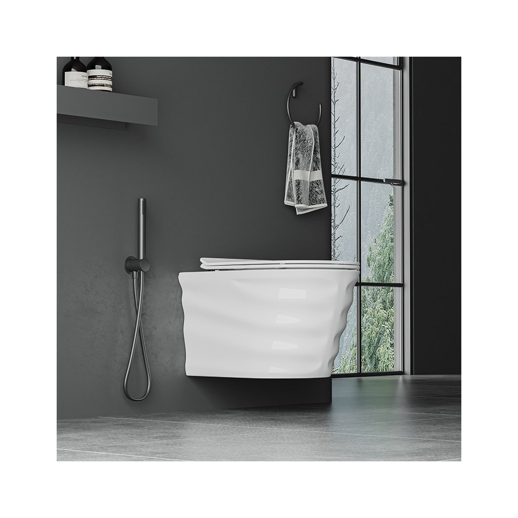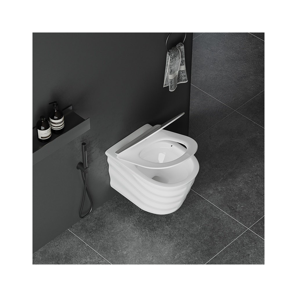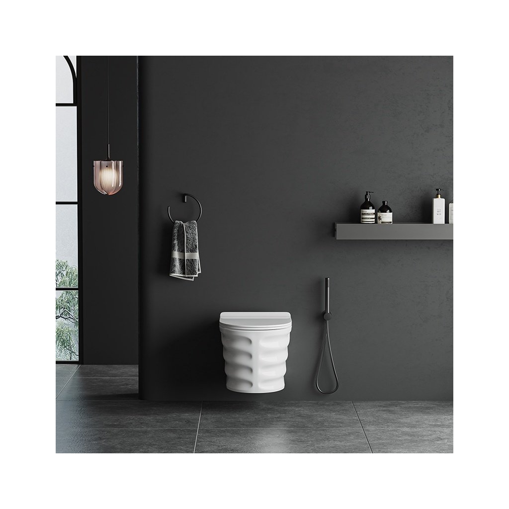 Tato WC mísa je synonymem moderny, kombinuje nejnovější technologie s elegantním designem pro zajištění maximálního komfortu používání. Bezpřírubový systém Rimless eliminuje těžko dostupná místa a usnadňuje čistění, technologie Easy Off umožňuje snadnou demontáž WC prkénka. Pomaluzavírací sedátko z Duroplastu UF se systémem tichého zavírání SoftClose zvyšuje komfort používání. Použití keramiky s glazurou ANTI-BACTERIAL GLAZE výrazně usnadňuje udržování čistoty, zabraňuje tvorbě vodního kamene a množení bakterií. Tato závěsná WC mísa se skvěle hodí do každé koupelny, nabízí úsporu místa a elegantní vzhled. Výběrem této WC mísy investujete do budoucnosti vaší koupelny, kombinujete styl, funkčnost a vyspělá technologická řešení. Tato WC mísa byla navržena v černé matné barvě s nevšedním, elegantním žebrovaným vnějším pláštěm, která se perfektně hodí do každého interiéru a dodává mu svěží a moderní vzhled.