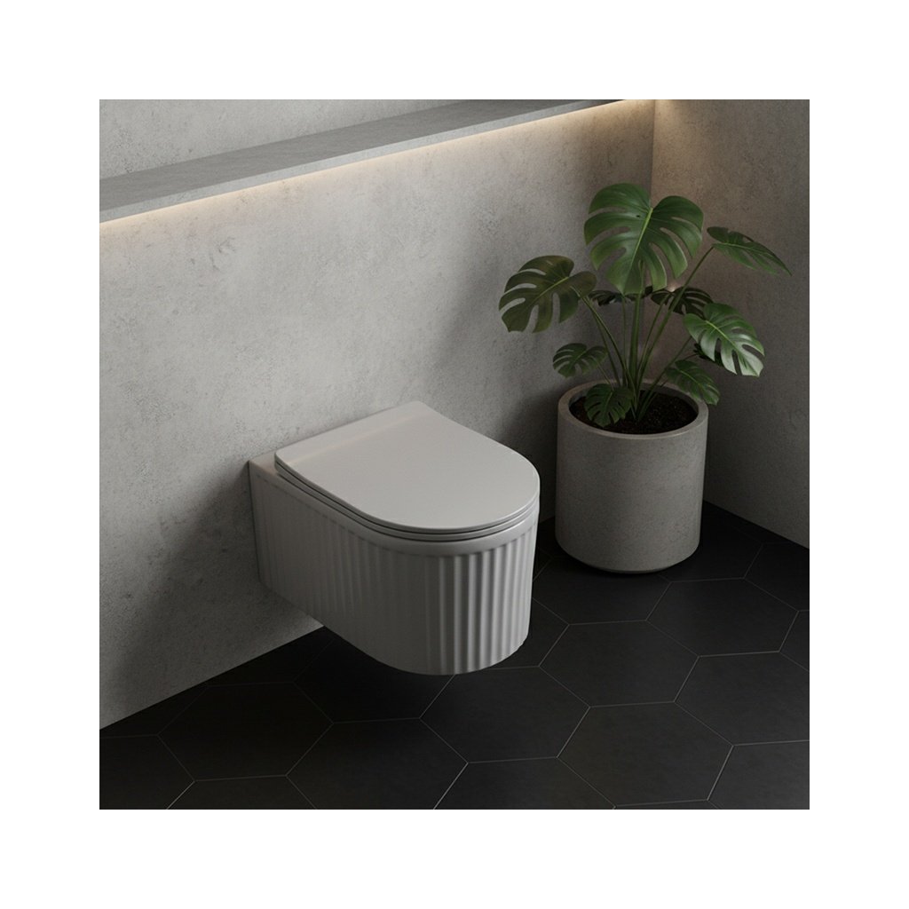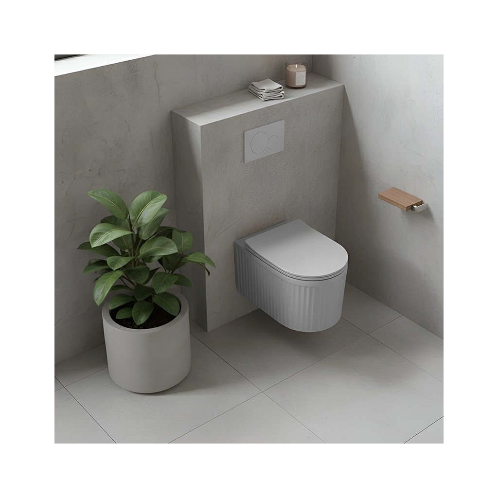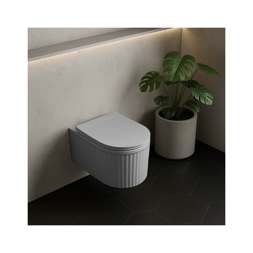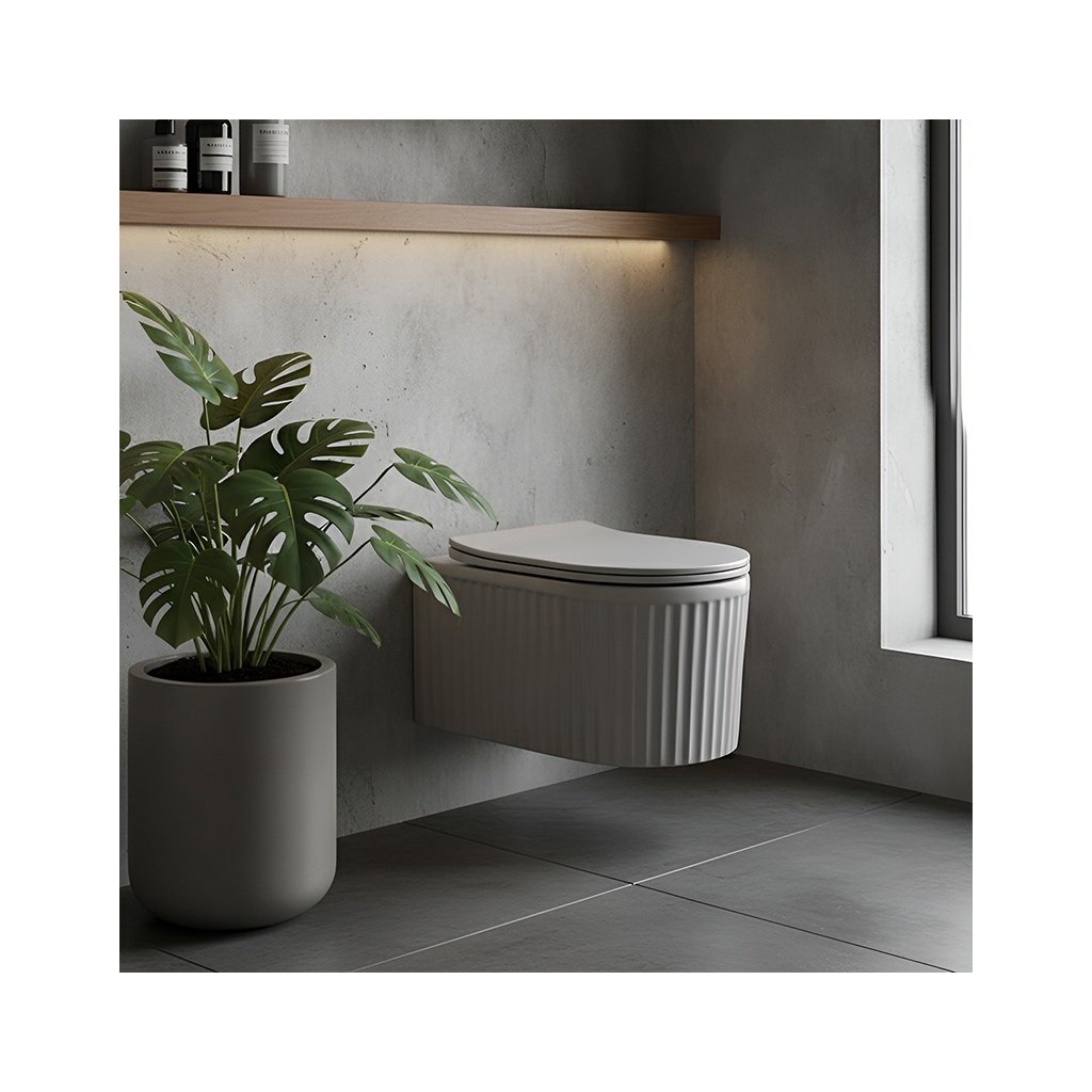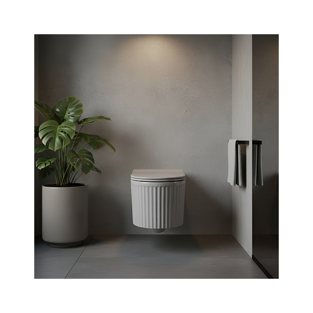 Tato WC mísa je synonymem moderny, kombinuje nejnovější technologie s elegantním designem pro zajištění maximálního komfortu používání. Bezpřírubový systém Rimless eliminuje těžko dostupná místa a usnadňuje čistění, technologie Easy Off umožňuje snadnou demontáž WC prkénka. Pomaluzavírací sedátko z Duroplastu UF se systémem tichého zavírání SoftClose zvyšuje komfort používání. Použití keramiky s glazurou ANTI-BACTERIAL GLAZE výrazně usnadňuje udržování čistoty, zabraňuje tvorbě vodního kamene a množení bakterií. Tato závěsná WC mísa se skvěle hodí do každé koupelny, nabízí úsporu místa a elegantní vzhled. Výběrem této WC mísy investujete do budoucnosti vaší koupelny, kombinujete styl, funkčnost a vyspělá technologická řešení. Tato WC mísa byla navržena v bílé barvě s nevšedním, elegantním žebrovaným vnějším pláštěm, která se perfektně hodí do každého interiéru a dodává mu svěží a moderní vzhled.