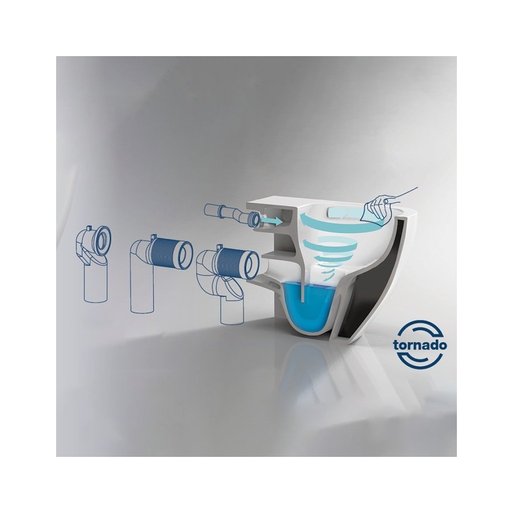 WC mísa je vybavena inovativním systémem splachování Tornádo, který zajišťuje spirálové proudění vody pod vysokým tlakem. Díky tomu dochází k efektivnímu a tichému oplachu celé vnitřní plochy, čímž se zvyšuje účinnost splachování a prodlužuje čistota mísy. Tento systém minimalizuje hlučnost a zároveň snižuje spotřebu vody.