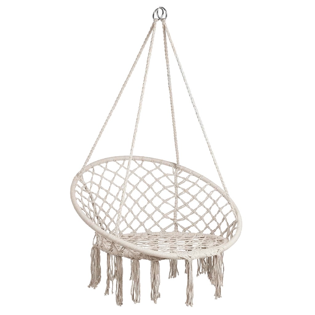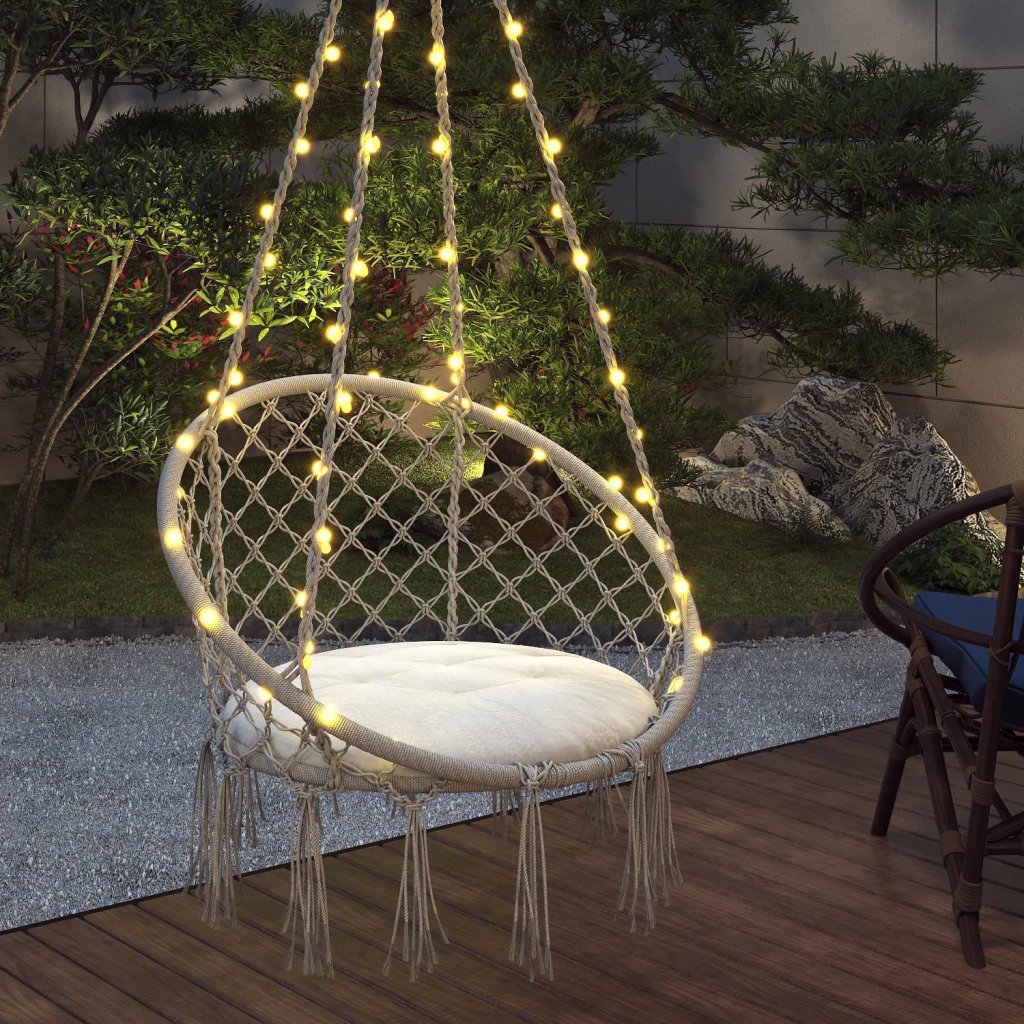 Vysoce kvalitní závěsná houpačka v boho stylu je vyrobena ze 2 kovových obručí a pletené šňůry odolné proti namáhání.