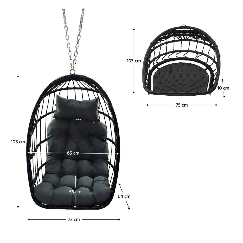 Závěsné křeslo NOBELO představuje dokonalou kombinaci moderního designu a maximálního pohodlí pro vaše chvíle relaxace. Díky své skládací konstrukci je mimořádně praktické a umožňuje snadné uskladnění v době, kdy jej zrovna nepoužíváte. Elegantní černé provedení v kombinaci s kvalitním umělým ratanem dodá vašemu interiéru či exteriéru nádech luxusu a vytvoří útulné místo pro odpočinek.