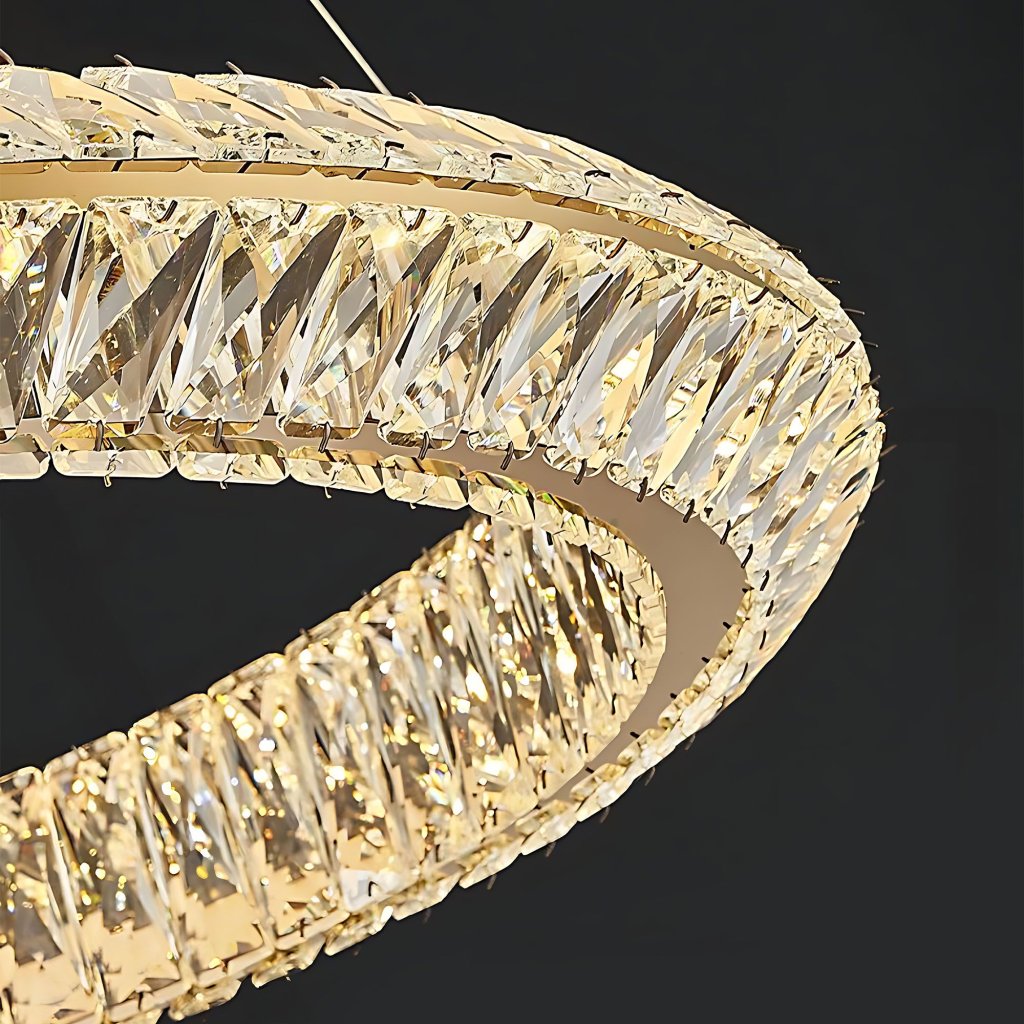 Kruhový lustr s křišťálovými prvky kolem stínidla spojuje dekorativní charakter s moderní formou. Kovový kruh v zlatém provedení a otevřený, opakující se vzor křišťálových prvků, skrz které proniká světlo, tvoří krásnou a efektivní dekoraci každého elegantního interiéru.