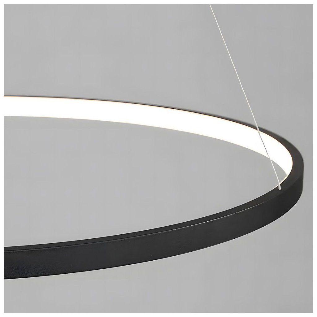 Závěsné LED osvětlení o průměru 80 cm je moderním a funkčním řešením pro osvětlení obývacího pokoje, jídelny nebo kanceláře. Konstrukce je tvořena lehkým kruhovým rámem v matně černém provedení, zavěšeným na tenkých, výškově nastavitelných lankách, které umožňují přizpůsobit výšku montáže podle potřeb prostoru.