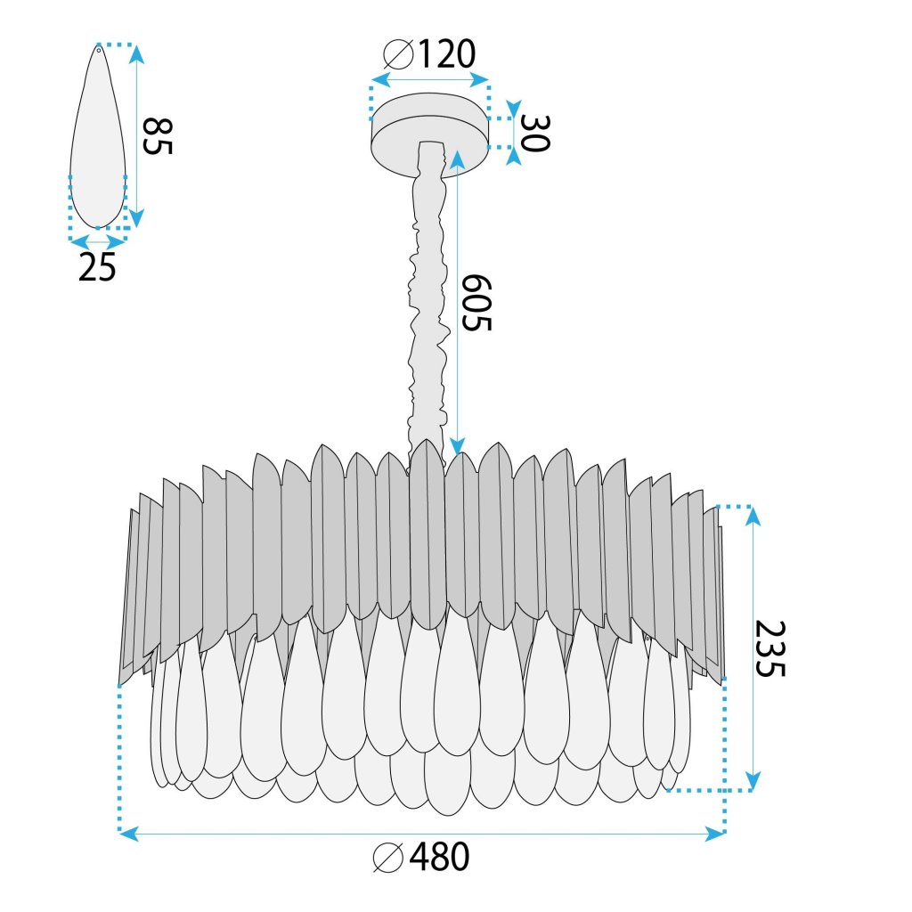 - Vlastnosti: kaskádovité skleněné krystaly, dekorativní kryt řetězu
