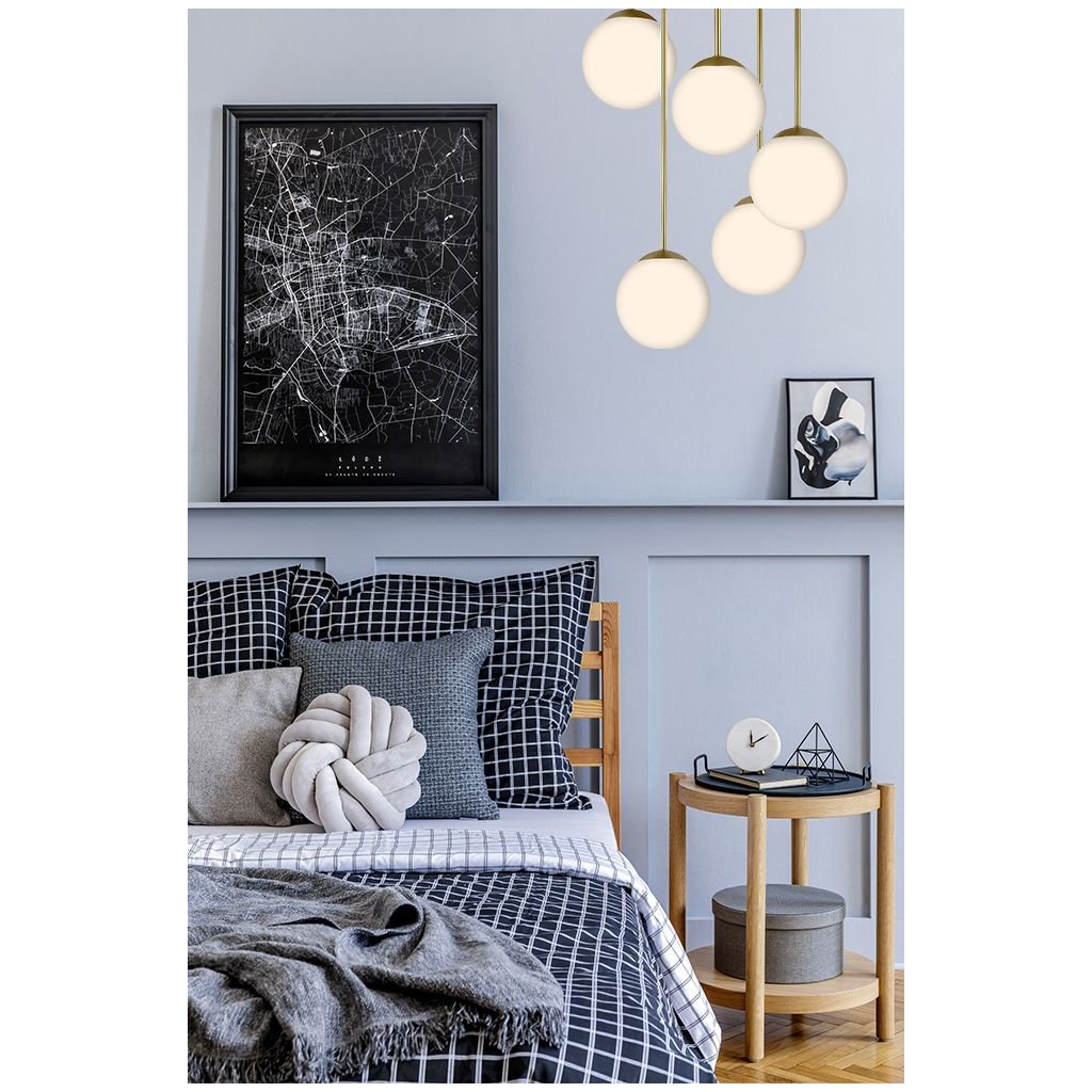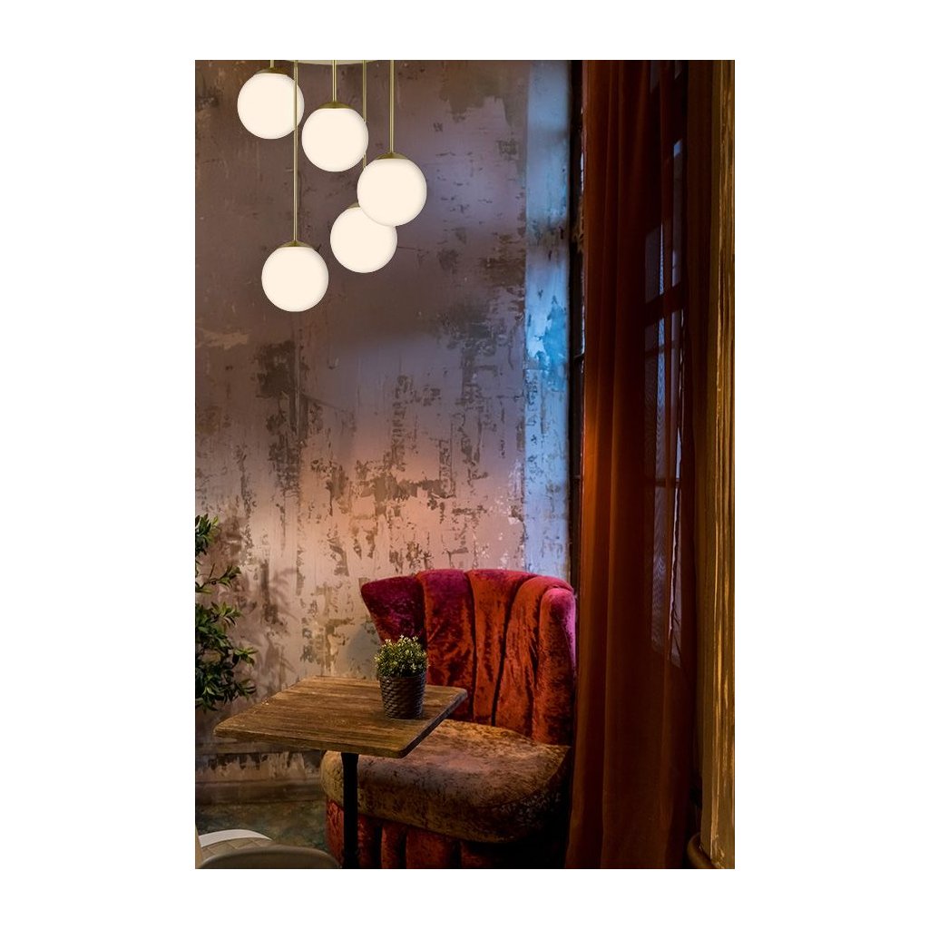 Vytvořte jedinečnou atmosféru ve svém interiéru díky elegantní stropní lampě s pěti stínidly. Stínidla jsou vyrobena z vysoce kvalitního bílého skla s matnou texturou. Zlatý kryt a kulatá stínidla rozptylují světlo, čímž vytvářejí příjemnou atmosféru v každé místnosti – od kuchyně přes ložnici až po stylovou kavárnu.