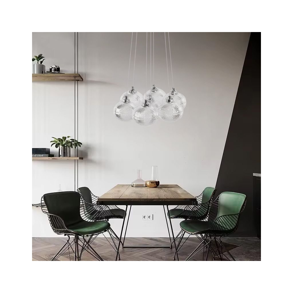 Tato elegantní závěsná lampa se sedmi dekorativními akrylovými stínidly je dokonalým spojením moderního designu a klasické estetiky. Transparentní stínidla s efektními detaily krásně rozptylují světlo a vytvářejí jedinečnou atmosféru v každém interiéru. Lampa vynikne jako ústřední prvek v obývacím pokoji, jídelně, nad jídelním stolem nebo ve vysoké vstupní hale. Díky nastavitelné délce kabelů lze snadno přizpůsobit výšku zavěšení konkrétnímu prostoru. Chromované detaily dodávají moderní vzhled a kompatibilita s úspornými žárovkami G9 zajišťuje styl i praktičnost v jednom.