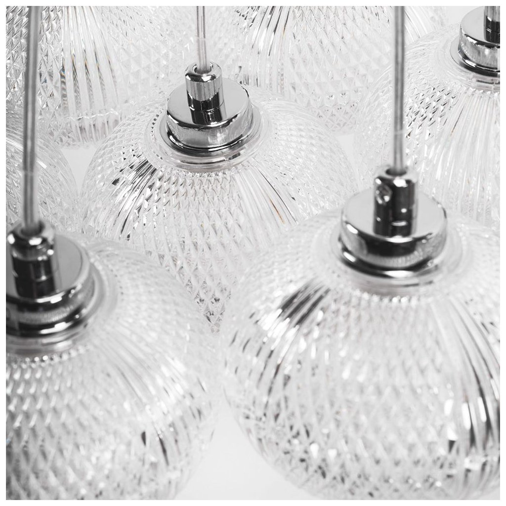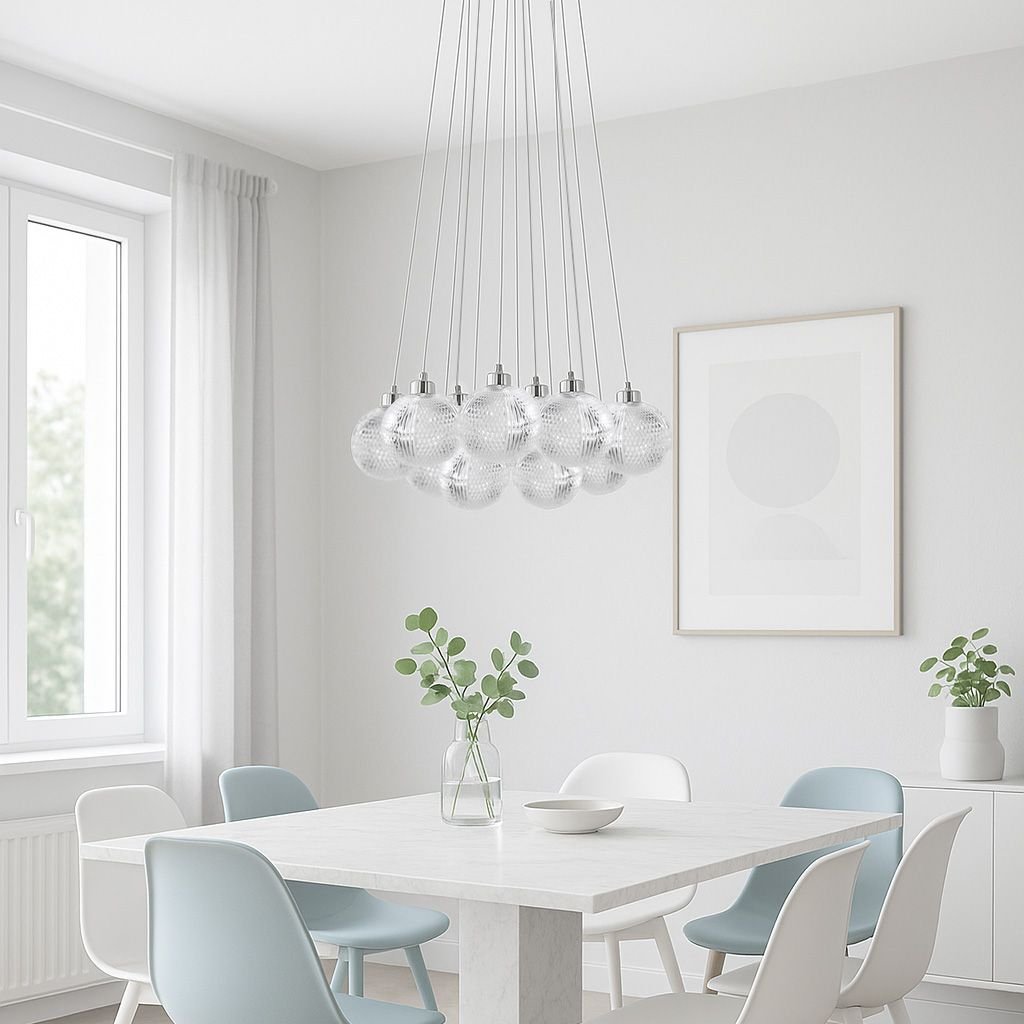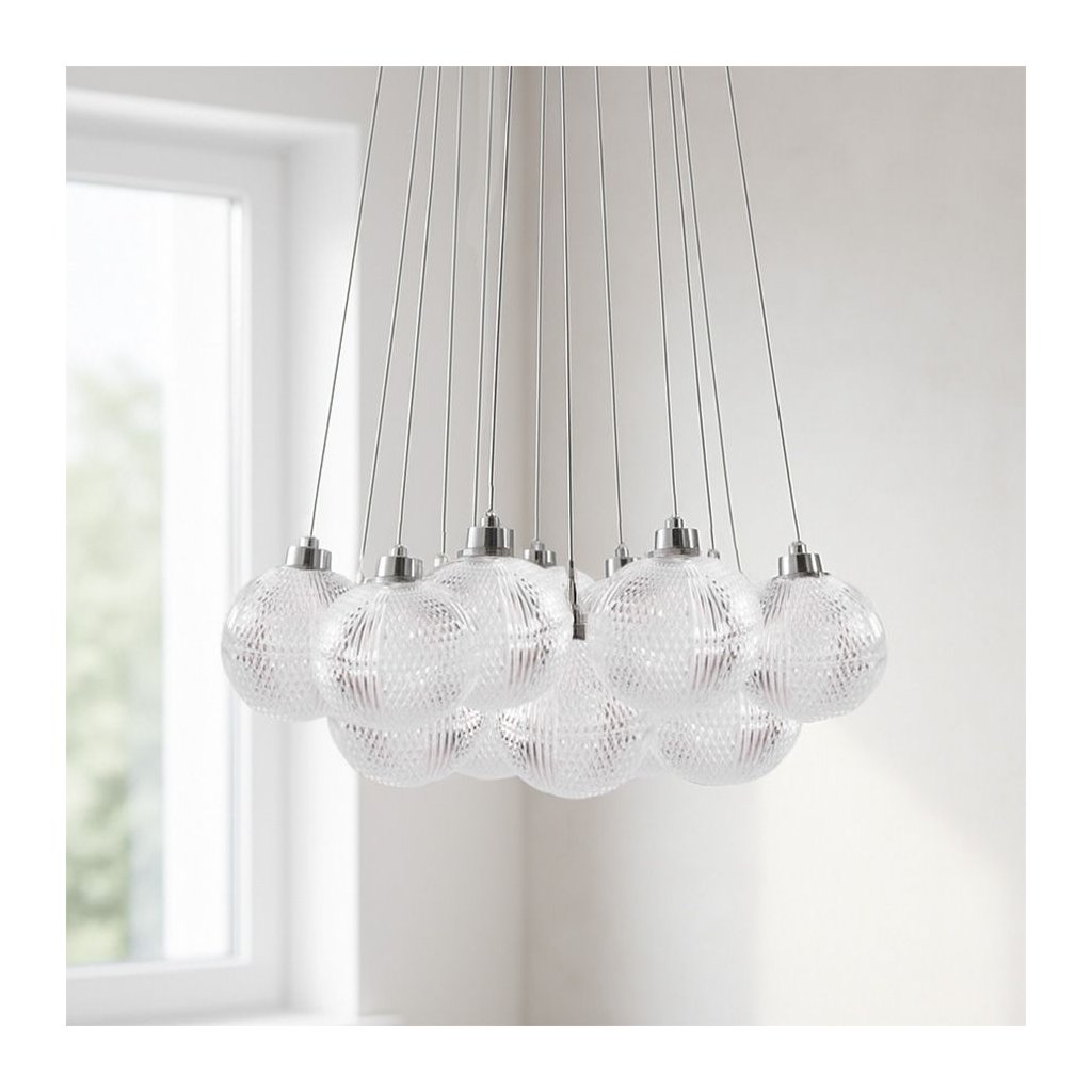 Tato elegantní závěsná lampa s třinácti dekorativními akrylovými stínidly spojuje moderní design s klasickou estetikou. Transparentní, zdobená stínidla krásně rozptylují světlo a vytvářejí jedinečnou atmosféru v každém prostoru. Lampa je ideální jako centrální prvek nad jídelním stolem, v obývacím pokoji, jídelně nebo ve vysokém vstupním prostoru. Díky nastavitelným kabelům lze snadno přizpůsobit výšku zavěšení podle konkrétního interiéru. Chromované detaily podtrhují moderní vzhled a možnost použití úsporných žárovek G9 zajišťuje styl i praktičnost zároveň.