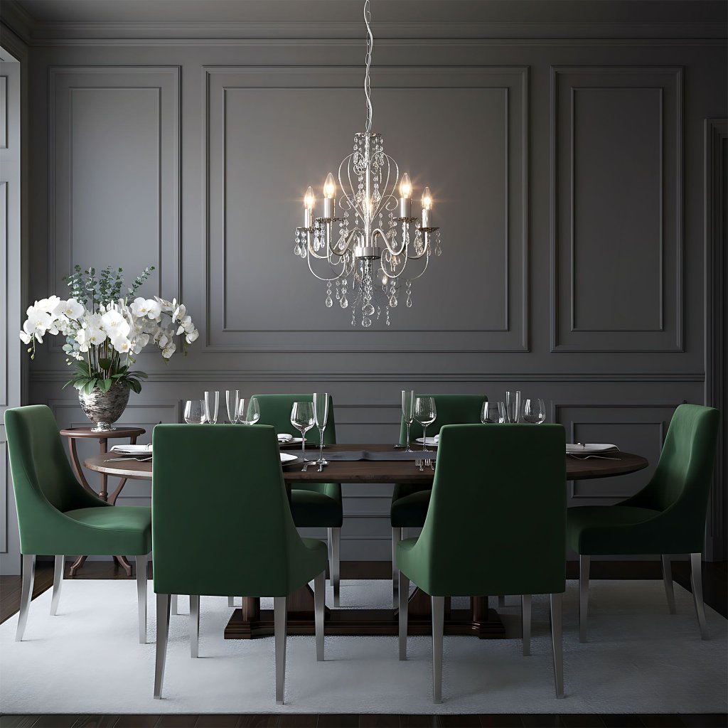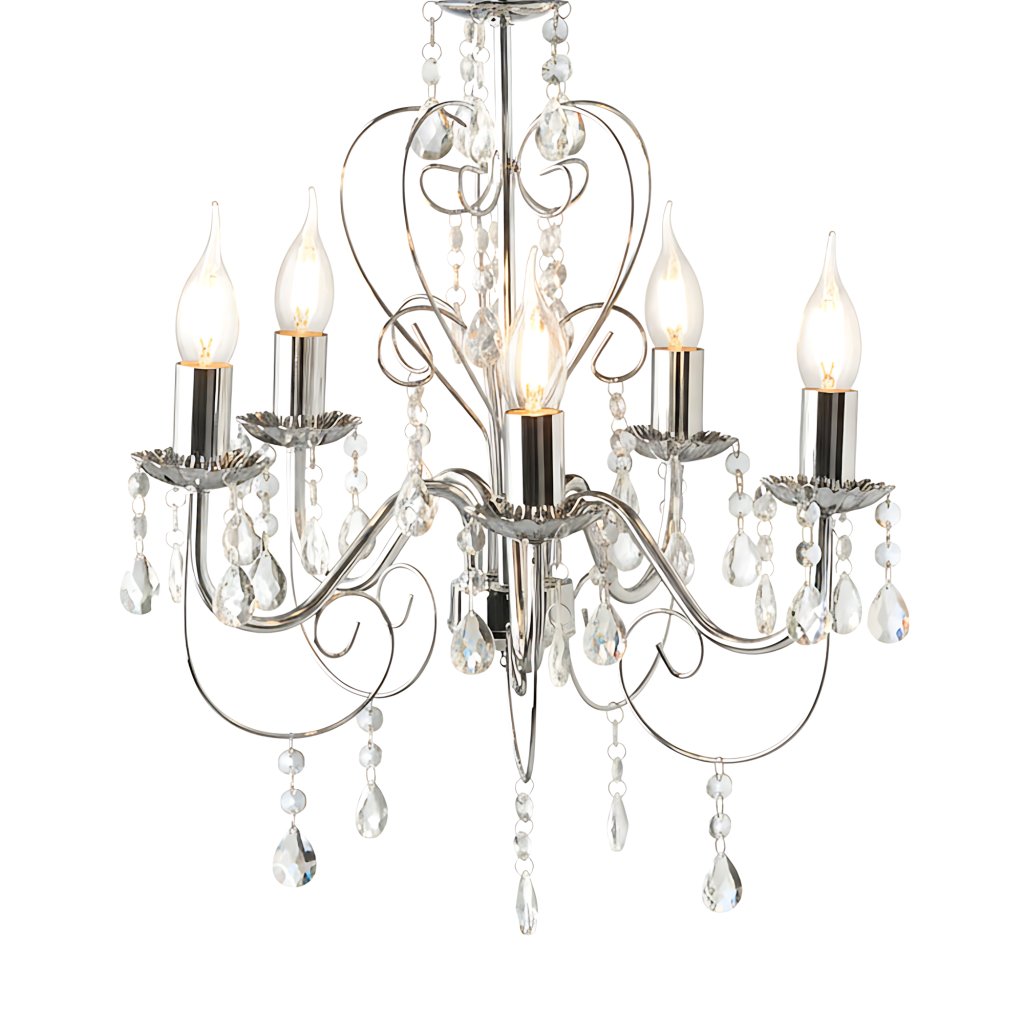 Stylový stropní lustr s pěti světelnými body spojuje klasický vzhled s jemným leskem. Kovová konstrukce vytváří elegantní tvar, zatímco dekorativní prvky z průhledného materiálu jemně odrážejí světlo a vytvářejí příjemnou a útulnou atmosféru.