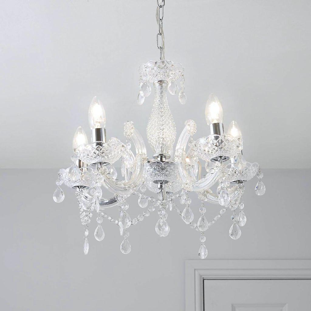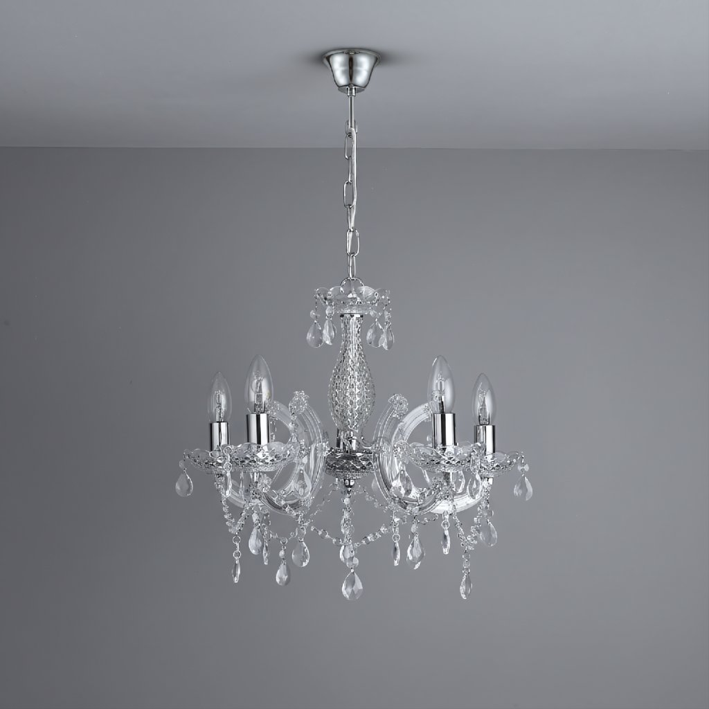 Klasičtější lustr se pěti světelnými body kombinuje lesk chromu s průhlednými dekorativními závěsky, čímž vytváří reprezentativní atmosféru v místnosti. Lustr nabízí rovnoměrné a efektivní osvětlení díky pěti ramenům a jeho regulovatelná výška až 123 cm umožňuje snadné přizpůsobení prostoru.