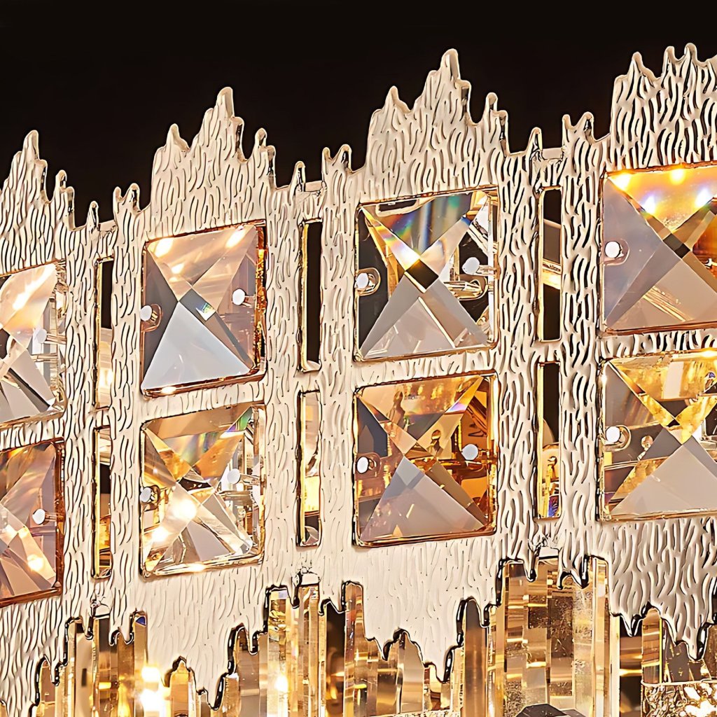 Exkluzivní křišťálová lampa spojuje moderní design s klasickým třpytem křišťálů. Její výjimečná konstrukce kombinuje skleněné slzy s elegantním zlatým rámem, čímž vytváří mimořádně efektní vzhled. Křišťálové detaily uspořádané ve vrstvách krásně odrážejí světlo a dodávají interiéru luxusní a stylový charakter.