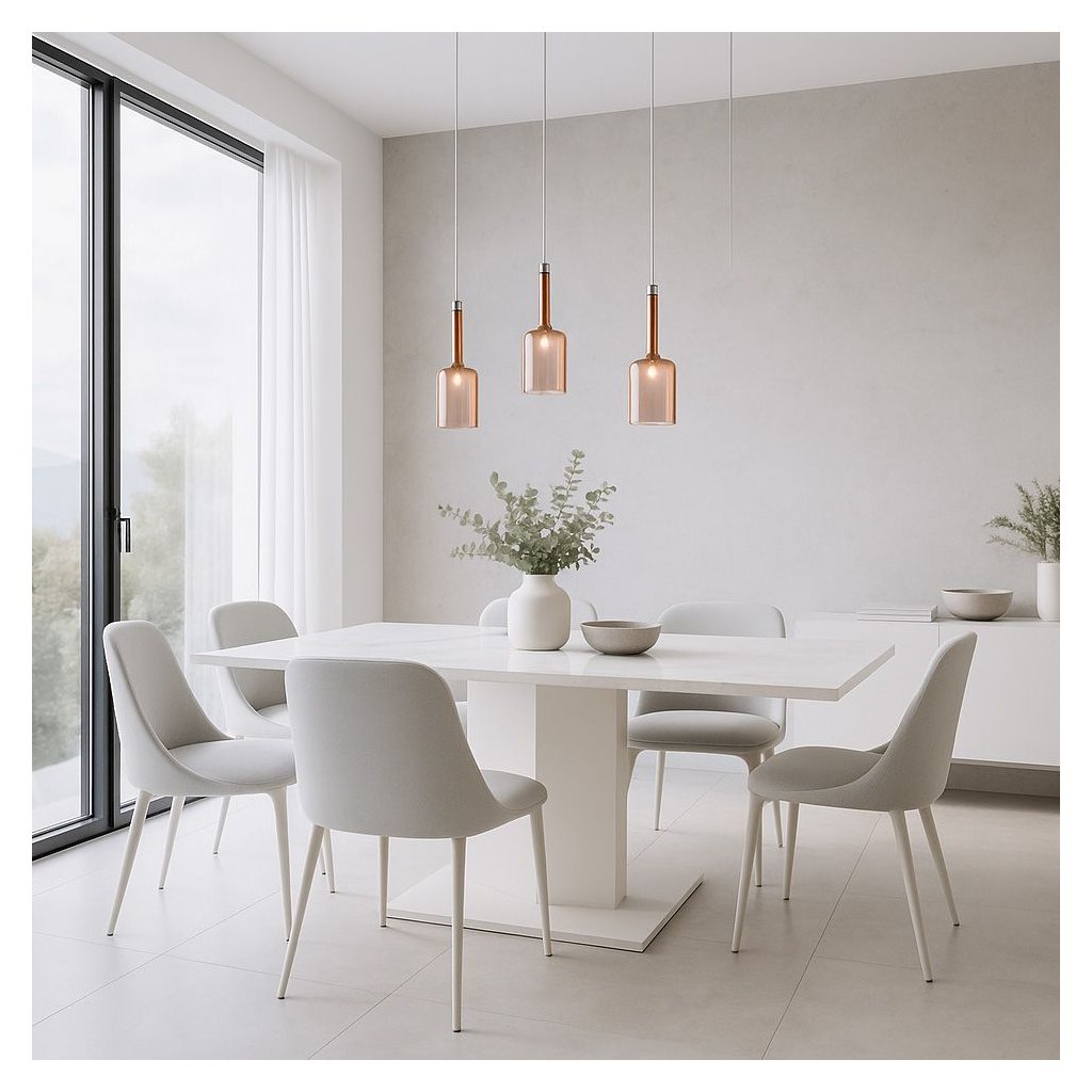 Toto osvětlení je vyrobeno z kombinace skla a kovu, kde převládající materiál je sklo a maskovací kryt je z kovu v elegantní jantarové barvě. Osvětlení je navrženo pro energeticky úspornou žárovku G4, což přispívá k efektivnímu a dlouhodobému používání.Délku kabelu lze snadno přizpůsobit dle potřeby, což umožňuje dokonale ladit osvětlení s interiérem a specifickým aranžmá. Tento model poskytuje možnost personalizace a skvěle zapadne do různých prostorů, ať už jde o obývací pokoj, jídelnu nebo jiné oblasti s moderním stylem.