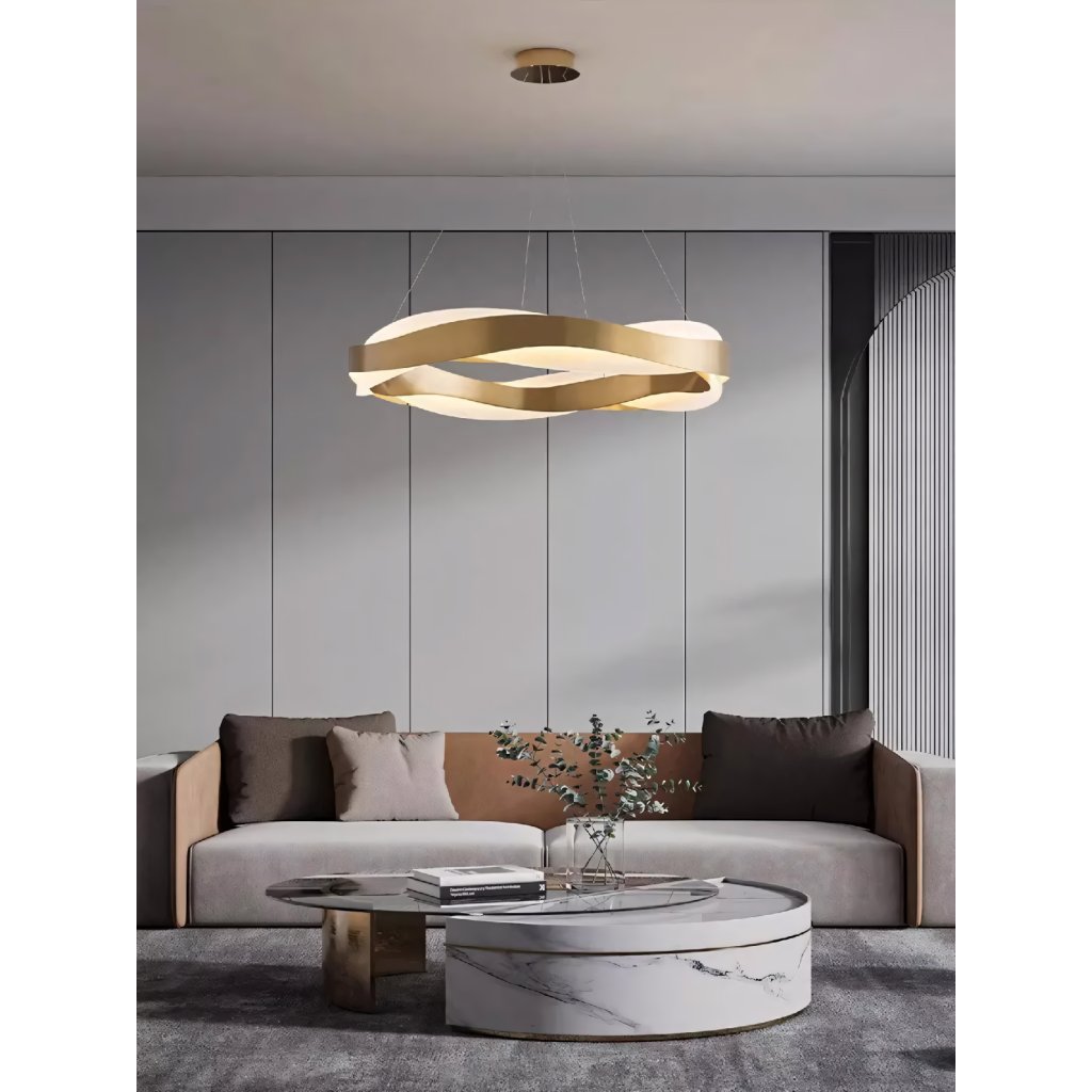 Tato závěsná LED lampa je dokonalou volbou pro každého, kdo hledá inovativní design a vysokou funkčnost v jednom. Svítidlo zaujme svou dynamickou, organicky vlnící se formou, která v kombinaci s povrchem v barvě kartáčovaného zlata působí luxusně a nadčasově. Kvalitní materiály z kovu a odolného plastu zaručují dlouhou životnost, zatímco propracovaný tvar zajišťuje rovnoměrné rozptýlení světla do celého prostoru.