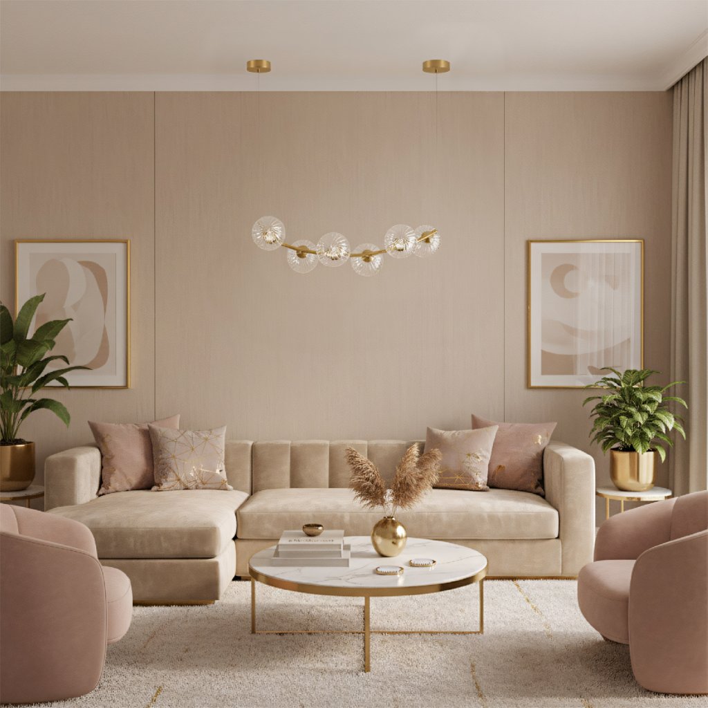 Tato závěsná lampa je skvělou volbou pro každého, kdo hledá stylové a funkční osvětlení s nádechem luxusu. Kovová konstrukce ve zlatém provedení nese šest elegantních stínidel z rýhovaného skla, která dodávají svítidlu jemnost a unikátní charakter. Svítidlo je navrženo tak, aby se stalo dominantou místnosti a zároveň poskytovalo dostatek světla pro každodenní činnosti v moderním domově.