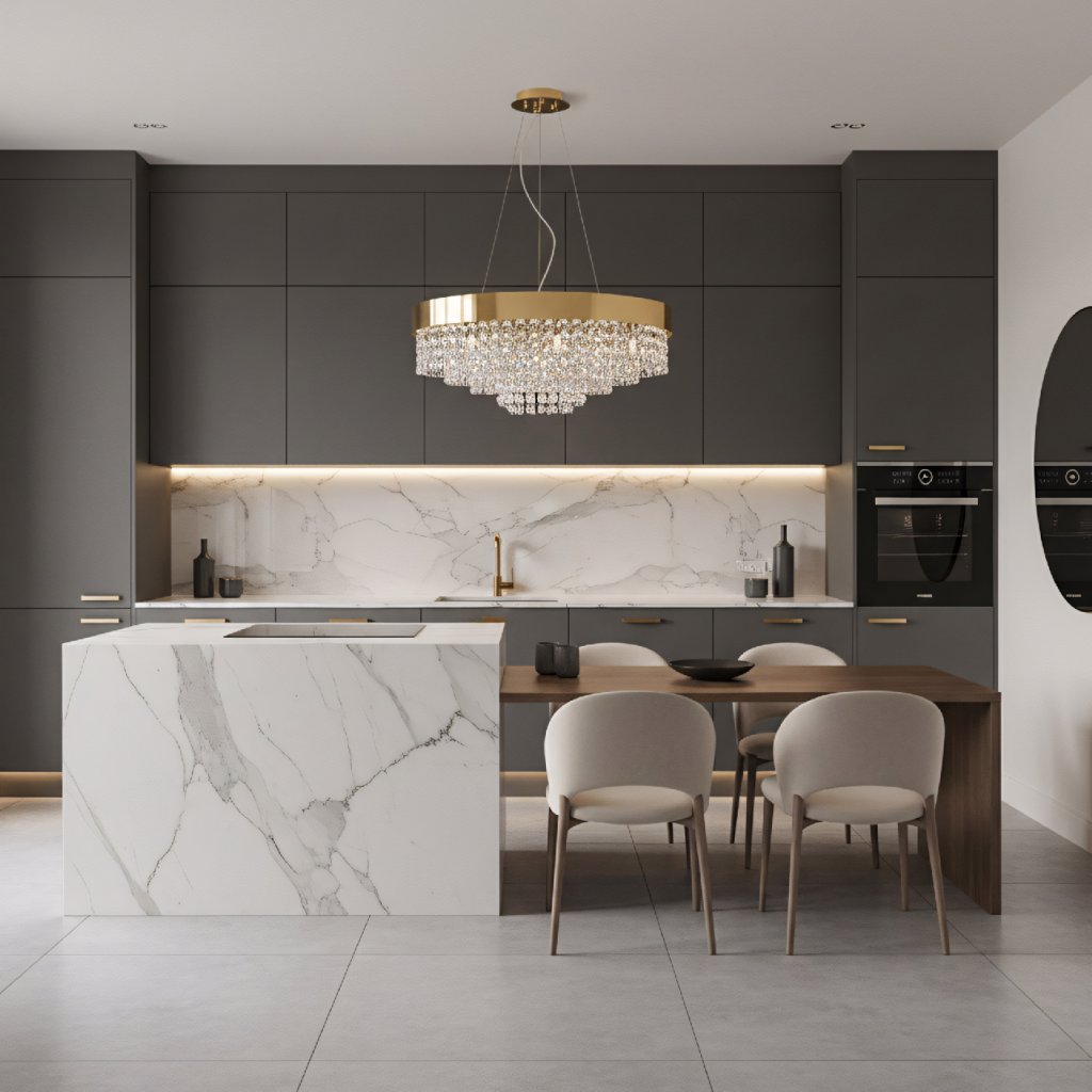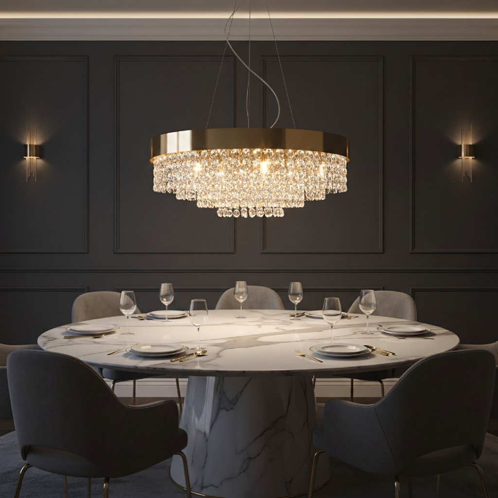 Zlaté provedení v kombinaci s křišťálovými odlesky je symbolem nadčasové elegance, která vynikne v moderních i klasicky laděných prostorách. Výrazným benefitem je regulace výšky pomocí závěsných lanek, díky čemuž lze svítidlo nastavit až do délky 900 mm. Lampa se tak snadno přizpůsobí jak prostorám se standardní výškou stropu, tak i otevřeným galeriím či vysokým místnostem v rezidenčních objektech.