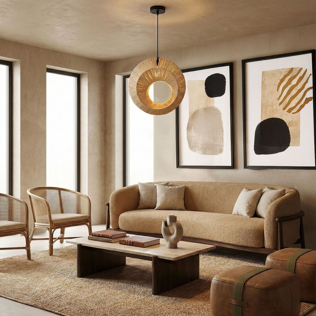 Tato závěsná lampa je perfektní volbou pro každého, kdo hledá kombinaci přírodních materiálů a unikátního designu. Svítidlo vyrobené z papírové rafiové šňůry přináší do interiéru teplo a harmonii. Díky své lehké konstrukci a preciznímu zpracování se stane výrazným dekorativním prvkem, který zútulní obývací pokoj, ložnici i jídelnu.