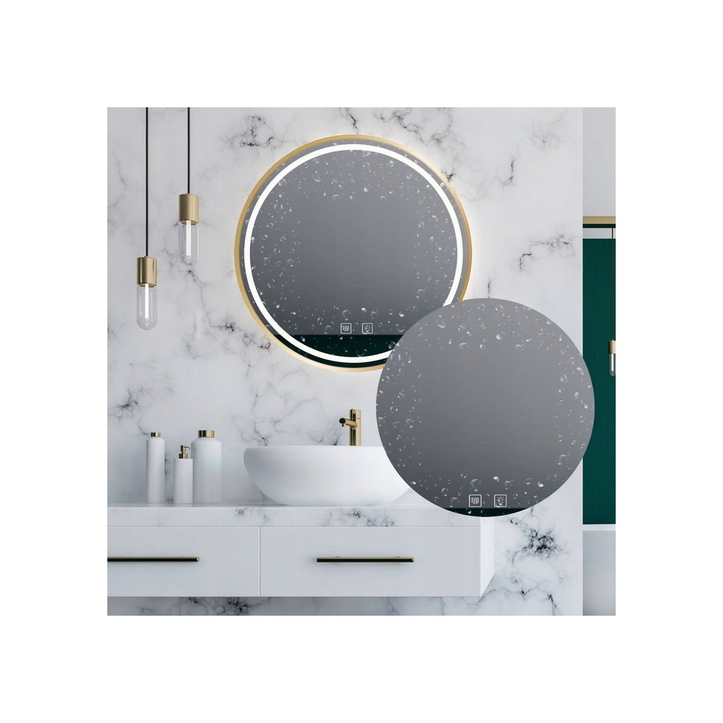 * První fotografie ukazuje reálný vzhled zrcadla. Ostatní fotografie mohou vyobrazovat tvarově podobné zrcadlo umístěné v aranžmá koupelny.Nástěnné koupelnové LED zrcadlo s dotykovým vypínačem